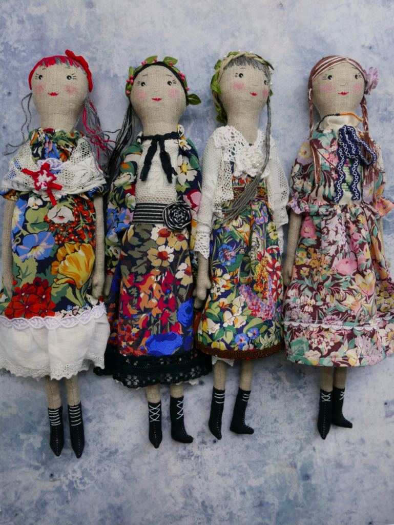And the result? A gathered sort-of kimono robe, in the prettiest, drapiest Liberty silk, which I’m really happy with and which I think compliments the other outfits very well. It’s the doll second from left in the photo below, but not having taken any decent photos of it before sending the dolls off to Sarah Campbell, I can only apologise that you can’t actually see it very well.